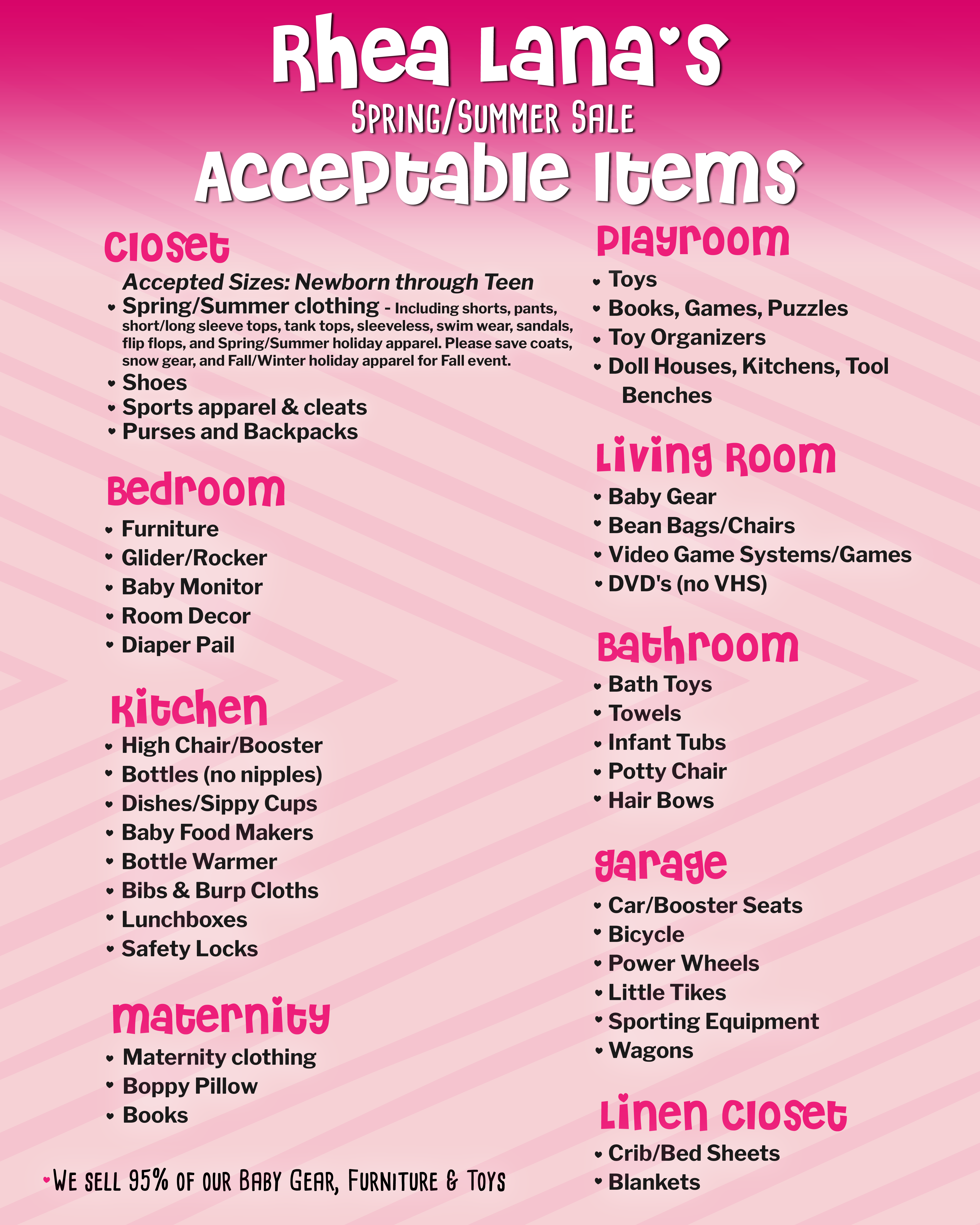 For a complete list of acceptable items this sale, See Spring & Summer 26 Consignor Guide here